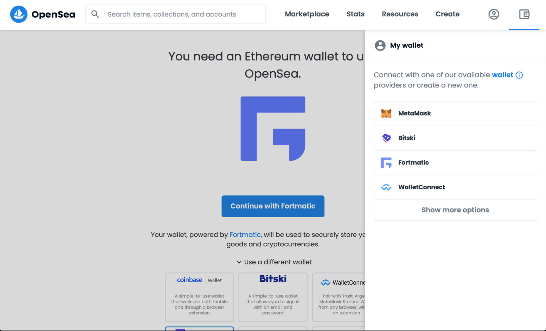Step 6: Once you are all set up, head back over to opensea.io and connect your wallet to OpenSea (if it isn’t already). Do this by clicking on the wallet icon on the far right again.You will notice your default cryptocurrency is Ethereum (ETH). Since the most economically viable chain and currency as of writing is MATIC on Polygon, you will need to create a bridge or chain which allows these two networks to talk.