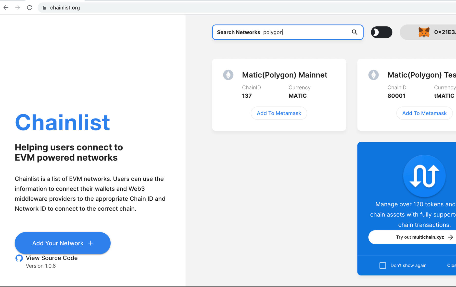 Step 7: Go to https://chainlist.orgMake sure your MetaMask wallet is connected. Do so by clicking "Connect Wallet"In the search bar type "polygon" and Matic (Polygon) Mainnet will appear. Click “Add to Metamask.”