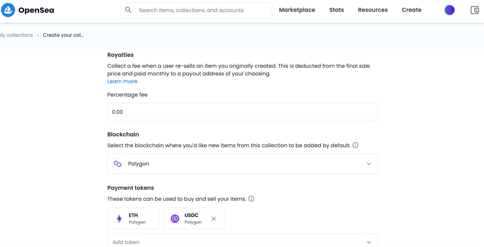 Blockchain: IMPORTANT! Select Polygon from the dropdown, NOT Ethereum. If Polygon doesn’t appear, go back to step 7 to ensure Polygon is associated with your MetaMask wallet.Payment Tokens: Not a big deal, but we recommend you also add USDC Polygon. This allows for a stablecoin option.