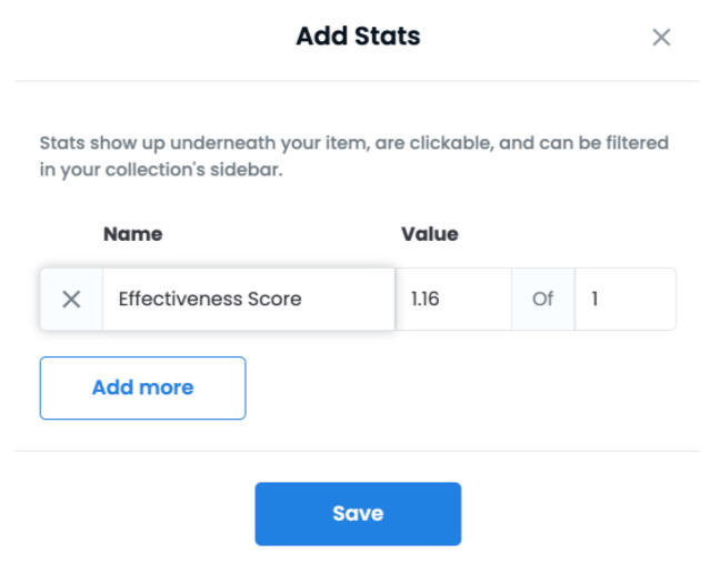 *SPECIAL NOTE ONLY FOR STUDENTS MINTING NFTS FOR A TEACHER OR INSTRUCTOR:If you are a student minting an NFT for a teacher, please click the “+” button in the Stats row. Type in “Effectiveness Score” or “Teacher Effectiveness Score” In the first box, type in the average score. This was by taking every student's anonymous vote worth a score of either 1.25, 1 or .75 (teacher exceeded syllabus, met syllabus, needs improvement on delivering syllabus). Add those scores and divide by the total number of students.